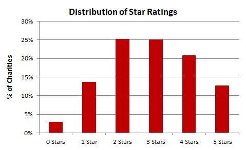 The current distribution of star ratings for all charities rated by Charity Intelligence has the majority at 2 and 3 stars.  Charity Intelligence changed from a 4-star rating to 5-star rating in October 2020.